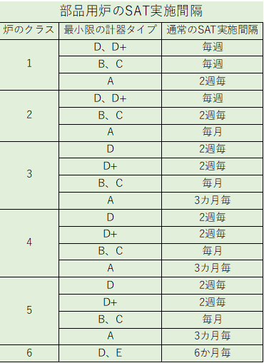 またSATの実施間隔は、炉のクラスおよび計器タイプ(第4回で概説)によって規定されています。右表は、部品用炉[3]のSATの定期的な実施間隔を示しています。SATはこのような定期的な実施以外に、炉を最初に使用する前や計器やセンサーを交換した際等にも実施が必要となります。炉が予防保全計画(PM計画)に従って、維持管理されている場合には、この通常のSAT実施間隔を延長することが可能です。